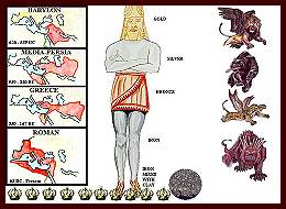 El primer imperio sería el de Babilonia, el 2º representado por la plata, sería el Medo - Persa, el 3º de bronce sería el Griego, y el 4º y último imperio, el hierro, sería el imperio Romano el cual estaría presente en la 1ª venida del Señor y en su 2ª venida.